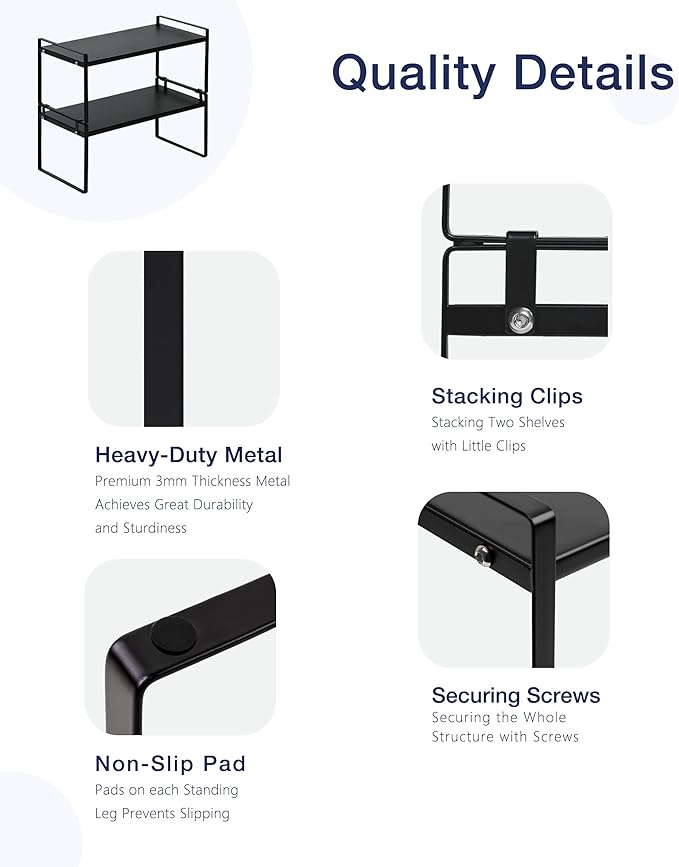 - CHARACTER DESIGN: This cabinet shelf can create plenty of space for your household items such as cups, pots, bottles, bowls, cookware, or canned foods without dominating space in your cabinet. This stylish cabinet shelf fits neatly on the countertop to keep your essentials organized and easily accessible.