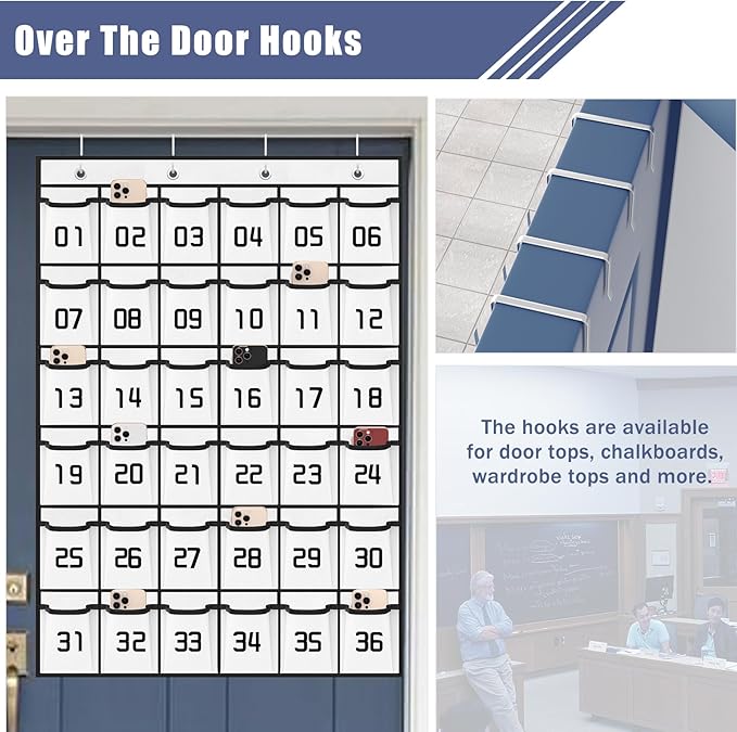 - 【4 Metal Hooks for Classroom Pocket Chart】 Calculator Phone pouch fit the top of whiteboard or over the door as thick as 1.3"-2", hanging organizer with pockets supports the weight of 36 phones (about 24 lb), easy to install and close the door.