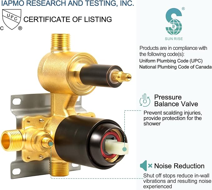- Install with Confidence: SR SUN RISE Shower System has cUPC Certification and compliance with the following standard(s): ASME A112.18.1-2018/CSA B125.1-18. Designed for use with standard 1/2" U.S. plumbing connections. Approved by the California Energy Commission.