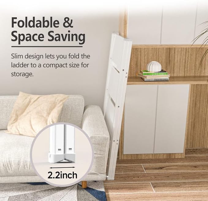 - Fold Narrowly Only 2.17 Inch - Folding design for easily hidden away and easily brought out when you necessary. The foldable ladder can be placed in a closet, put under a bed, hung behind a door, or placed in a narrow corner. Folded:35.24''H X 17.52"L X 2.17"W