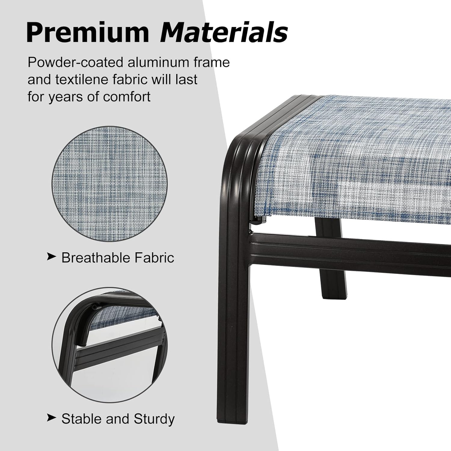 - Structure of the patio ottomans are made of sturdy aluminum and resin textliene, so the ottomans are stable and resilient.In addition, the powder coated surface can prevent chair from rusting for long term use.