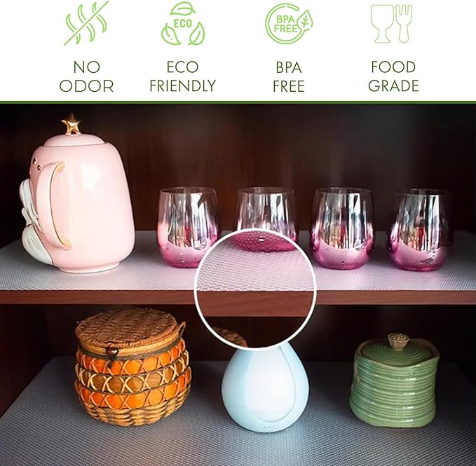 - MADE IN TURKEY: Our shelf liner was manufactured in our factory in Turkey. It is made out of high quality food grade EVA material. It is BPA free, so it is safe to be used in contact with fruits and vegetables directly. It is water proof, dust proof, and oil proof. It protects your shelves, cabinets, and drawers from scratching.