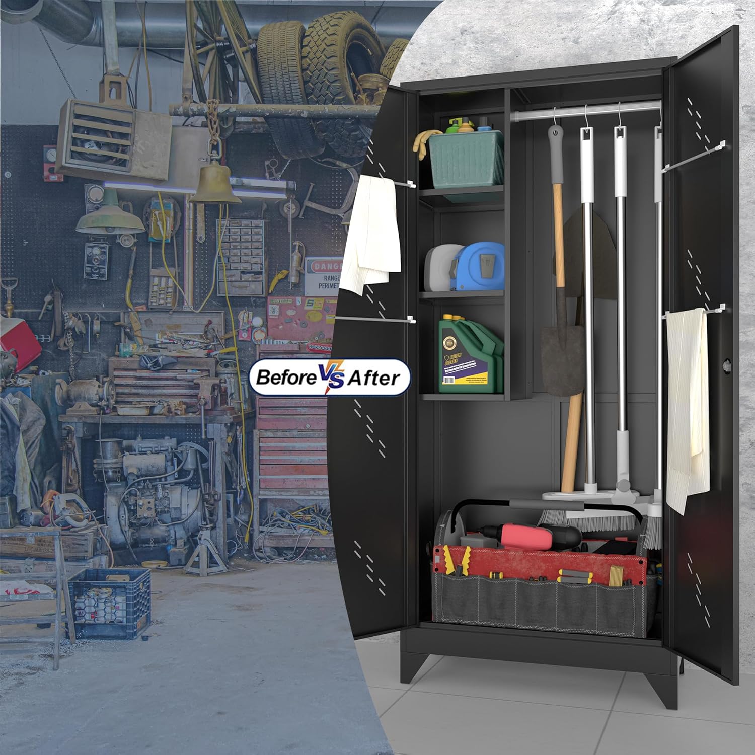 - 【Improved Functionality】-Our broom closet storage cabinet is designed with vents and perforated laminates at the bottom to prevent moisture and water accumulation. This feature allows you to safely store wet cleaning tools, making it the ideal choice for your cleaning tool storage needs. With doors and shelves, you can easily organize and access your items while keeping them protected from dust and dirt.