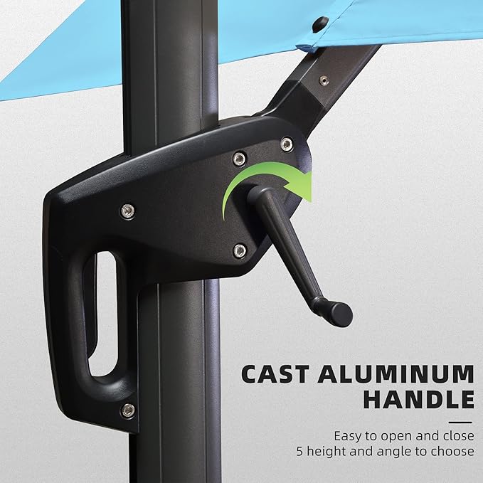- The crank system of this cantilever umbrella makes it easy to raise and lower the canopy, the unique handle design also makes tilting the umbrella effortless, foot pedal allows for complete 360 degree rotation