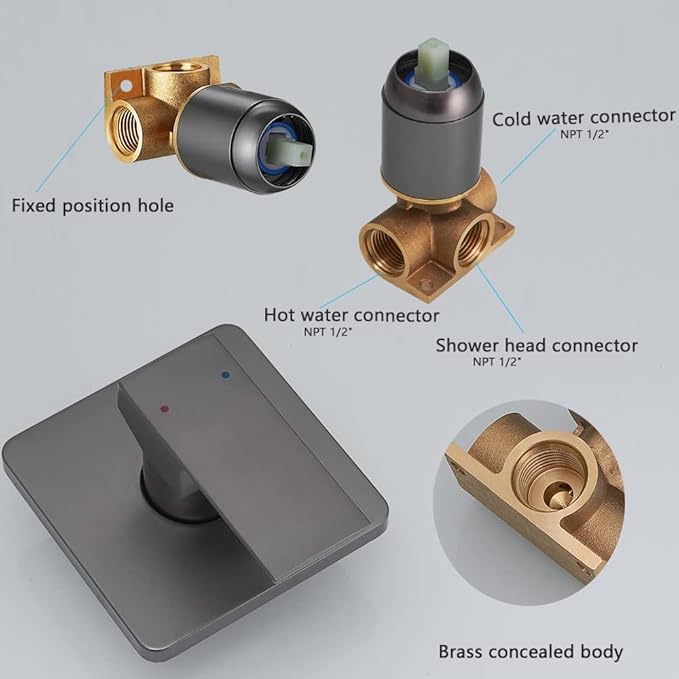 - MATERIAL: Grey 304 stainless steel shower head and wall mounted brass valve construction.