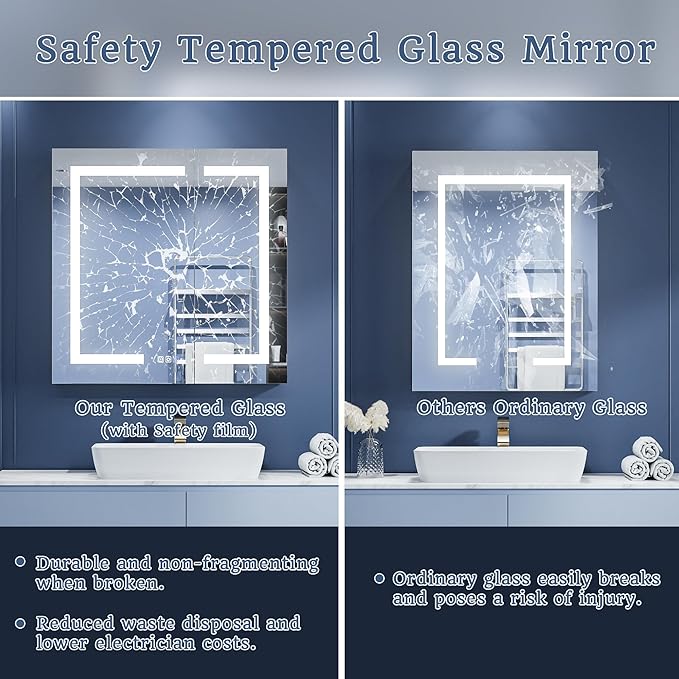 - 【Enhanced Defogging & Safety Protection】Experience clearer reflections with our newly upgraded medicine cabinet defogging technology. The mirror surface quickly warms to around 40°C, achieving a faster and safer defogging effect within minutes. For added safety, the defogging function automatically shuts off after 60 minutes, ensuring peace of mind. Built with an IP44-rated waterproof aluminum frame, this LED medicine cabinet delivers lasting durability and reliable protection in your bathroom.
