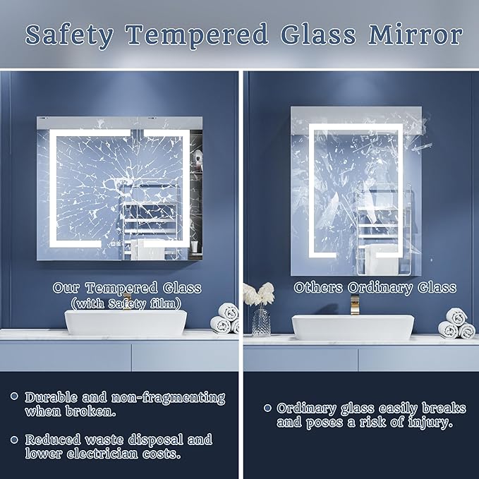 - 【Enhanced Defogging & Safety Protection】Experience clearer reflections with our newly upgraded medicine cabinet defogging technology. The mirror surface quickly warms to around 40°C, achieving a faster and safer defogging effect within minutes. For added safety, the defogging function automatically shuts off after 60 minutes or when the light is turned off, ensuring peace of mind. Built with an IP44-rated waterproof aluminum frame, this LED medicine cabinet delivers lasting durability and reliable protection in your bathroom.