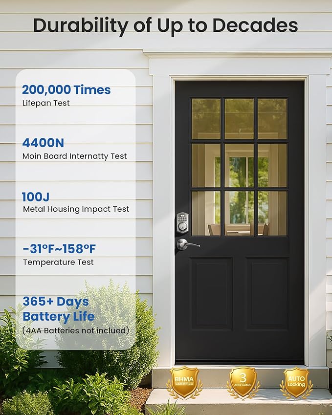 - Security Keypad Deadbolt: The ANSI Grade 3 smart door lock was made with sturdy lock cylinder and alloy, powered by four AA batteries, work last for more than one year