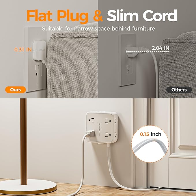 - Extension Cord Flat Wall Plug: This flat plug power strip 5 ft easily reaches distant outlets without excess length on the floor; 0.15 inch thick flat cord fits through door gaps and under carpet; 45 degree right angle design doesn't block the outlet below