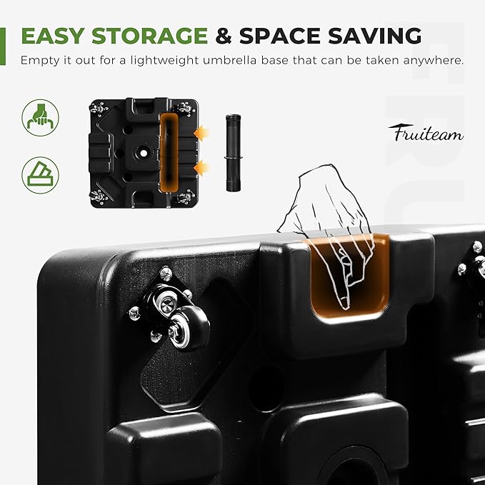 - [Easy Mobilty]: A set of 4 wheels allows you to effortlessly move the patio umbrella base around outdoor. and 2 lockssecure the sunshade in place to prevent the outdoor umbrella from tipping over or being blown away by gusts of wind.Carrying position at the bottom makes it easy for you to fill up water