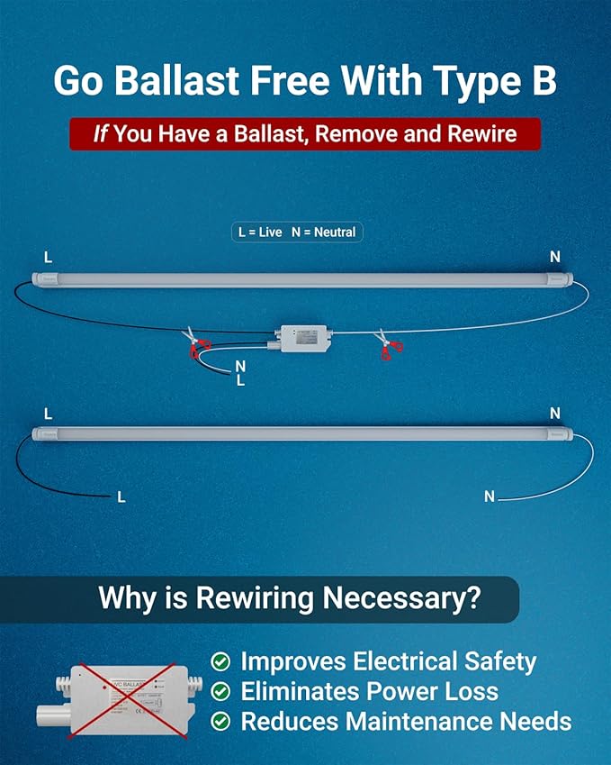 - ✅ WARNING: Prior to installing Type B tubes, all existing ballasts must be removed and the fixture rewired accordingly. Failure to do so may damage the lighting tube and create a serious fire hazard.