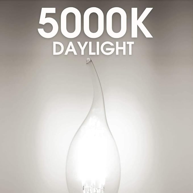 - 💡 [Daylight White] The 5000K LED candle light bulbs give off warm and comfortable lighting with 90+ High CRI (color rendering index). The bulbs deliver pleasing bright warm glow, crisp color, no strobe, great for indoor and outdoor enclosed lighting fixtures.