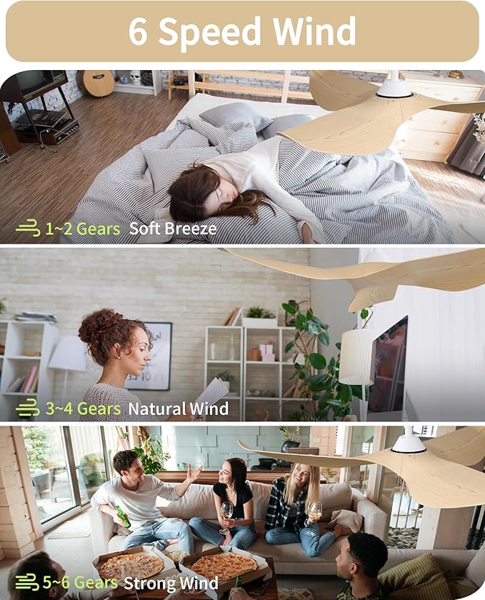 - 6 Speeds Wind - 1~2 Speeds natural wind, 3~4 speeds comfortable wind, 5~6 speeds strong wind. White ceiling fan allowing you to choose the ideal airflow intensity for your comfort needs.