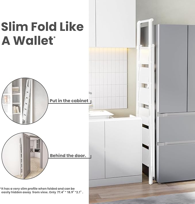 - Folds Slim to 2.2 '' Like A Wallet: Unfolded:70.5"H X46.5"L X 19"W,Folded: 77.4''H X 19"L X 2.1"W.It's very simple to open and close. The step ladder has a very slim profile when folded, so you can tuck it away in a small space and can be easily hidden away from view