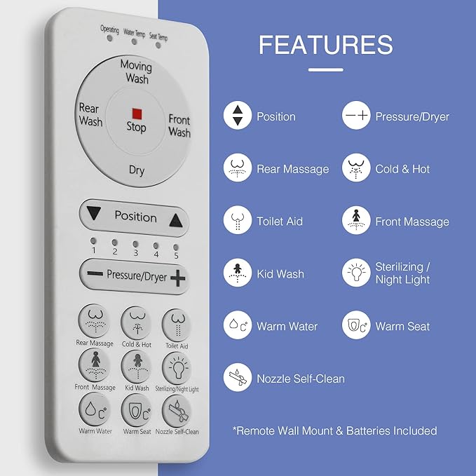 - Take control of your comfort with the easy-to-use remote control of our Bidet Seats. Adjust water temperature, pressure, and nozzle position with the touch of a button, ensuring a personalized and enjoyable cleansing experience.
