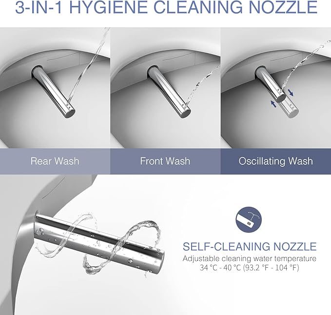 - Keep your Bidet Seats clear and fresh with the self-cleaning nozzle feature. Say goodbye to manual cleaning hassles and enjoy the convenience of a nozzle that cleans itself after each use.