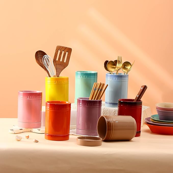 - 100% DISHWASHER SAFE : Other utensil crocks can rust, stain or scratch your countertops. Our ceramic cutlery holder has been crafted to offer your countertop the best looks and without worrying that you will scratch your surfaces.