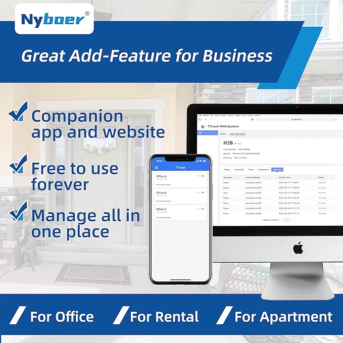 - [Add-Feature for Business]: Companion app and website with a convenient control center where you can easily synchronize all of your locks for management.No need to deal with frequent key exchanges, keyless entry smart lock gives you the ability to create timed access codes for guests, perfect for rental properties, Airbnb hosts and office use.