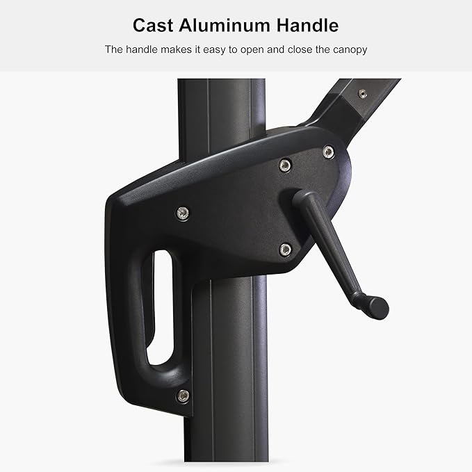 - The crank system of this cantilever umbrella makes it easy to raise and lower the canopy, the unique handle design also makes tilting the umbrella effortless, foot pedal allows for complete 360 degree rotation