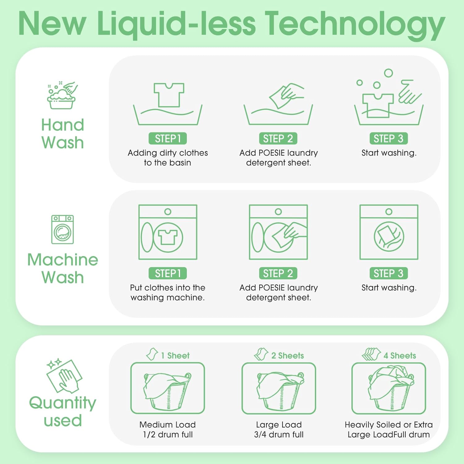 - Easier to Use - Liquidless detergent sheets, 1 sheet for small or medium loads where clothes are not very dirty, 2 sheets for large loads and 4 sheets for extra large loads, no waste. Not too little and not too much to save resources