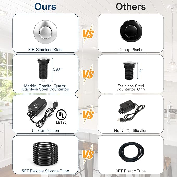 - 3.58” Extra Long for Any Countertop: The air switch button is 3.58” long, which fits any stainless steel sinktop and thicker countertops, like marble, quartz and granite, much wider applicable than those short 2.5” ones for stainless steel countertop only