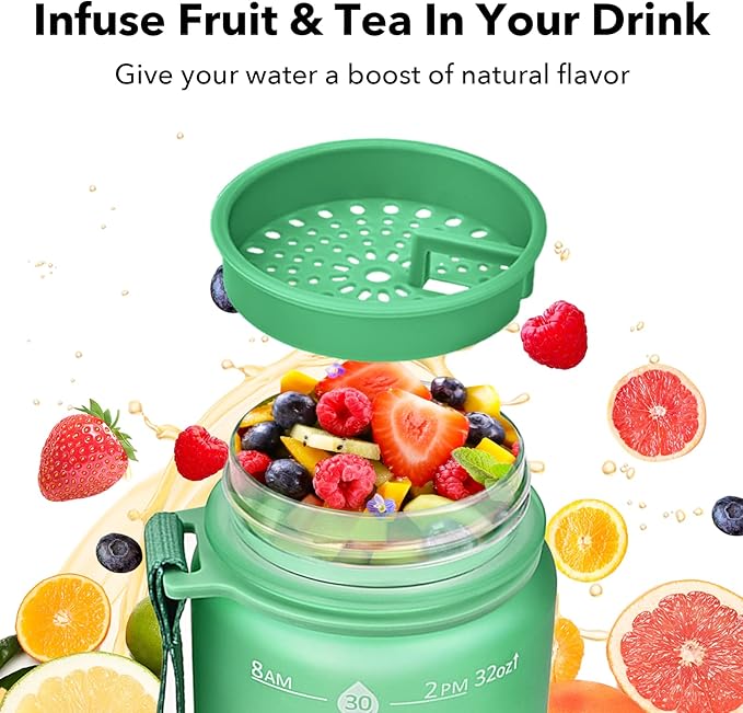 GOSWAG 32oz Motivational Water Bottles with Time Marker and Fruit Strainer, Sports Water Bottle with Times to Drink, Leakproof, Reusable Plastic Bottle with Strap no Straw for Gym, School