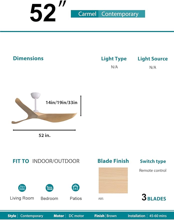 - Easy Installation: Diameter: 52", Height: 13.6"/18.6"/32.6" from ceiling to bottom (5" /10"/24'' Downrod for free choice), weight 14.55 lbs. Please install the 52 inch fan according to the instructions included in the box.