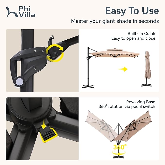 - 360° Swivel: You need to press the pedal to rotate the umbrella randomly. The bottom of the umbrella has a cross base to stabilize the umbrella. If you need more stability, you can add sandbags on top of the base.
