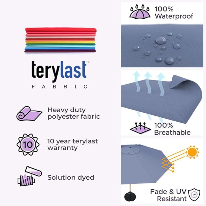 - [ INTELLIGENT DESIGN ]: Aluminum Pole: We don’t use rusting iron or steel! This pool umbrella has a thick 2.5mm wall that is rustproof and weather resistant that will provide peace of mind even under rainy weather. Both Terylast or Sunbrella fabrics are waterproof and solution dyed for optimal fade resistance under the beaming sun.