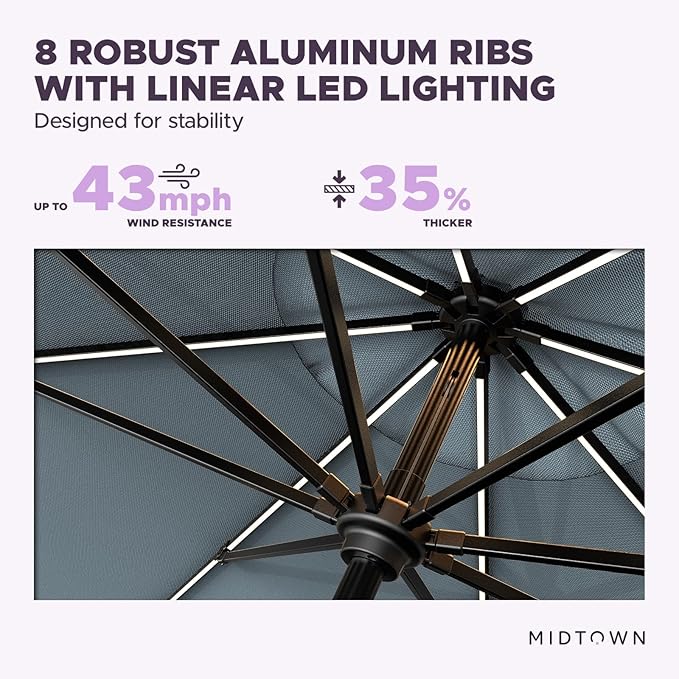 - [ PREMIUM QUALITY ]: Zinc Alloy Crank: For a seamless opening and closing system. Unlike low end patio table umbrellas, the crank and tilting component of this led patio umbrella is made from zinc-alloy, a very light, strong and durable metal that will withstand the many opening, closing and tilting.