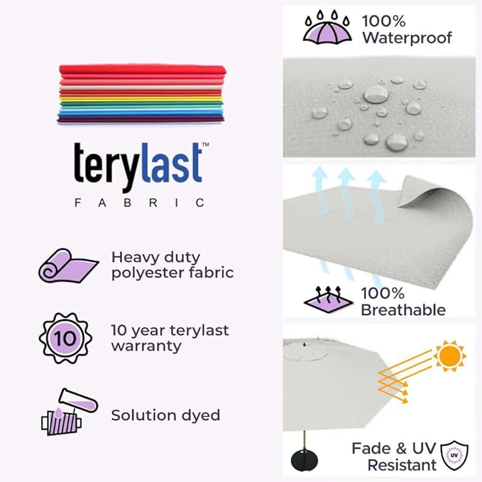 - [ INTELLIGENT DESIGN ]: Aluminum Pole: We don’t use rusting iron or steel! This pool umbrella has a thick 2.5mm wall that is rustproof and weather resistant that will provide peace of mind even under rainy weather. Both Terylast or Sunbrella fabrics are waterproof and solution dyed for optimal fade resistance under the beaming sun.