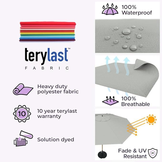 - [ INTELLIGENT DESIGN ]: Aluminum Pole: We don’t use rusting iron or steel! This pool umbrella has a thick 2.5mm wall that is rustproof and weather resistant that will provide peace of mind even under rainy weather. Both Terylast or Sunbrella fabrics are waterproof and solution dyed for optimal fade resistance under the beaming sun.