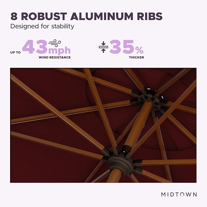 Midtown Umbrellas Sunbrella Umbrella Large Patio Umbrella 2-10 Feet in Burgundy Fabric, Auto-Tilt Aluminum Frame Backyard Umbrella, Deck Umbrella, Garden Umbrella & Porch Umbrella - Wooden Pole