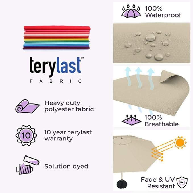 - [ INTELLIGENT DESIGN ]: Aluminum Pole: We don’t use rusting iron or steel! This pool umbrella has a thick 2.5mm wall that is rustproof and weather resistant that will provide peace of mind even under rainy weather. Both Terylast or Sunbrella fabrics are waterproof and solution dyed for optimal fade resistance under the beaming sun.