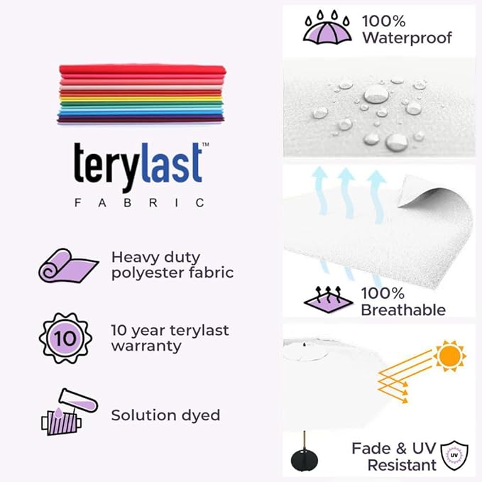 - [ INTELLIGENT DESIGN ]: Aluminum Pole: We don’t use rusting iron or steel! This pool umbrella has a thick 2.5mm wall that is rustproof and weather resistant that will provide peace of mind even under rainy weather. Both Terylast or Sunbrella fabrics are waterproof and solution dyed for optimal fade resistance under the beaming sun.
