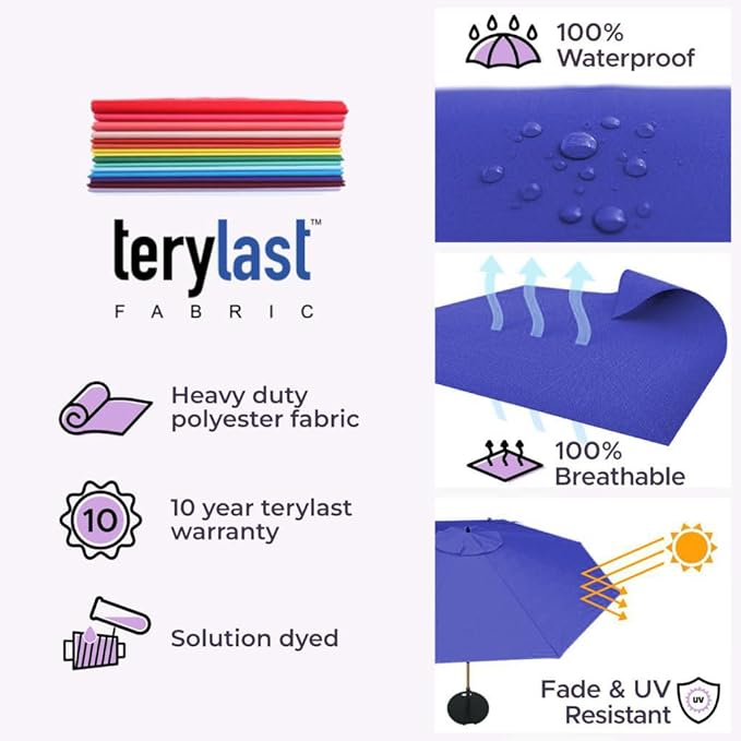 - [ INTELLIGENT DESIGN ]: Aluminum Pole: We don’t use rusting iron or steel! This pool umbrella has a thick 2.5mm wall that is rustproof and weather resistant that will provide peace of mind even under rainy weather. Both Terylast or Sunbrella fabrics are waterproof and solution dyed for optimal fade resistance under the beaming sun.