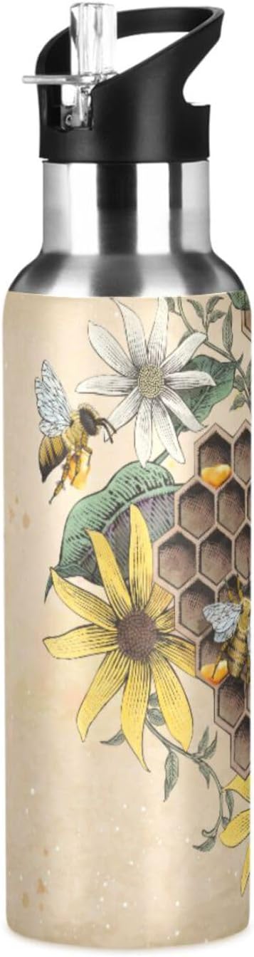ALAZA Honey Bee Retro Floral Water Bottle With Straw Lids Boys Girls,Vacuum Insulated Leakproof Stainless-Steel Sports Bottle Thermal Flask For Gym Yoga Camping,34Oz (1000Ml)