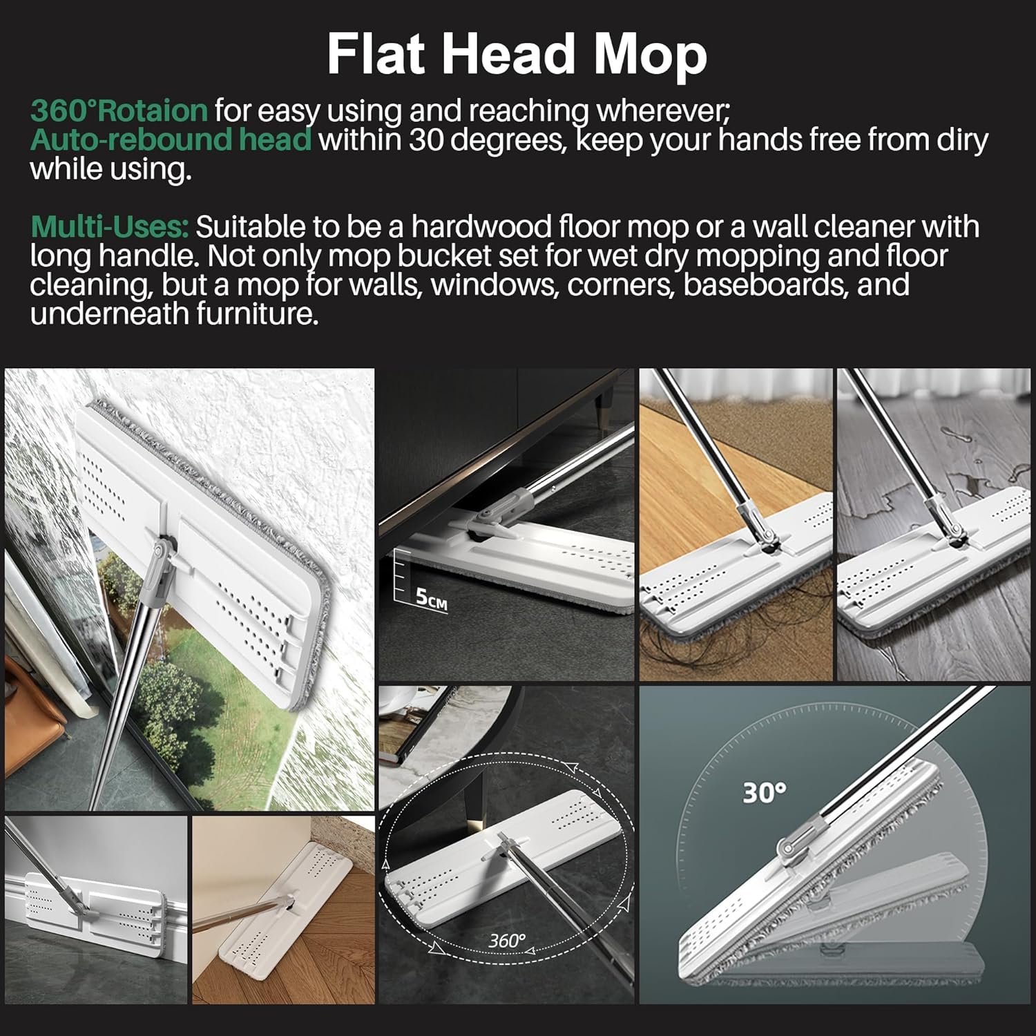 - [All-in-one Flat Mop and Bucket System] 2 separate chambers in bucket for washing and drying, scraper blade in wash to scratch away any dirt, hair or dust, scraper blade in dry to squeeze extra water, no water left after moping. Note: Please wet mop to avoid hard-insert problems