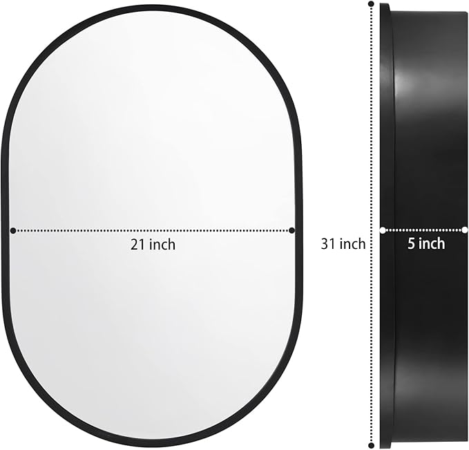 - High Quality Aluminum: This black oval mirrored medicine cabinet made of high quality aluminum and iron with powder coated to ensure durability, perfectly blend in various decoration styles. Anodized aluminum construction can resitant rust and chip.