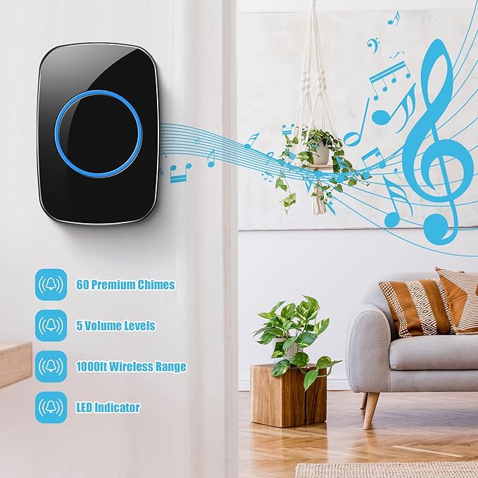 - Convenient to Use: the receiver of our ring doorbell has 60 different chimes, you can set different chimes in different installation locations, so that you can know the direction of visitors, the receiver has 5 levels of adjustable volume, you can adjust the volume arbitrarily to avoid disturbing, and this product uses AA batteries