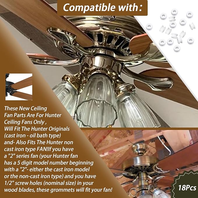 - √【Compatible with】:These New Ceiling Fan Parts Are For Hunter Ceiling Fans Only ,Will Fit The Hunter Originals (cast iron - oil bath type) and- Also Fits The Hunter non cast iron type FAN!If you have a "2" series fan (your Hunter fan has a 5 digit model number beginning with a "2"- either the cast iron model or the non-cast iron type) and you have 1/2" screw holes (nominal size) in your wood blades, these grommets will fit your fan!
