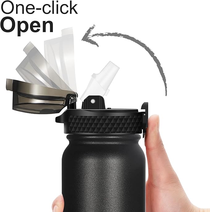 GOPPUS 20oz Insulated Stainless Steel Water Bottle with Straw Lid Reusable Leakproof Water Flask, Keeps Hot and Cold Sports Canteen Water Bottles for Kids Men Women Gym οΌBlack 1 LidοΌ