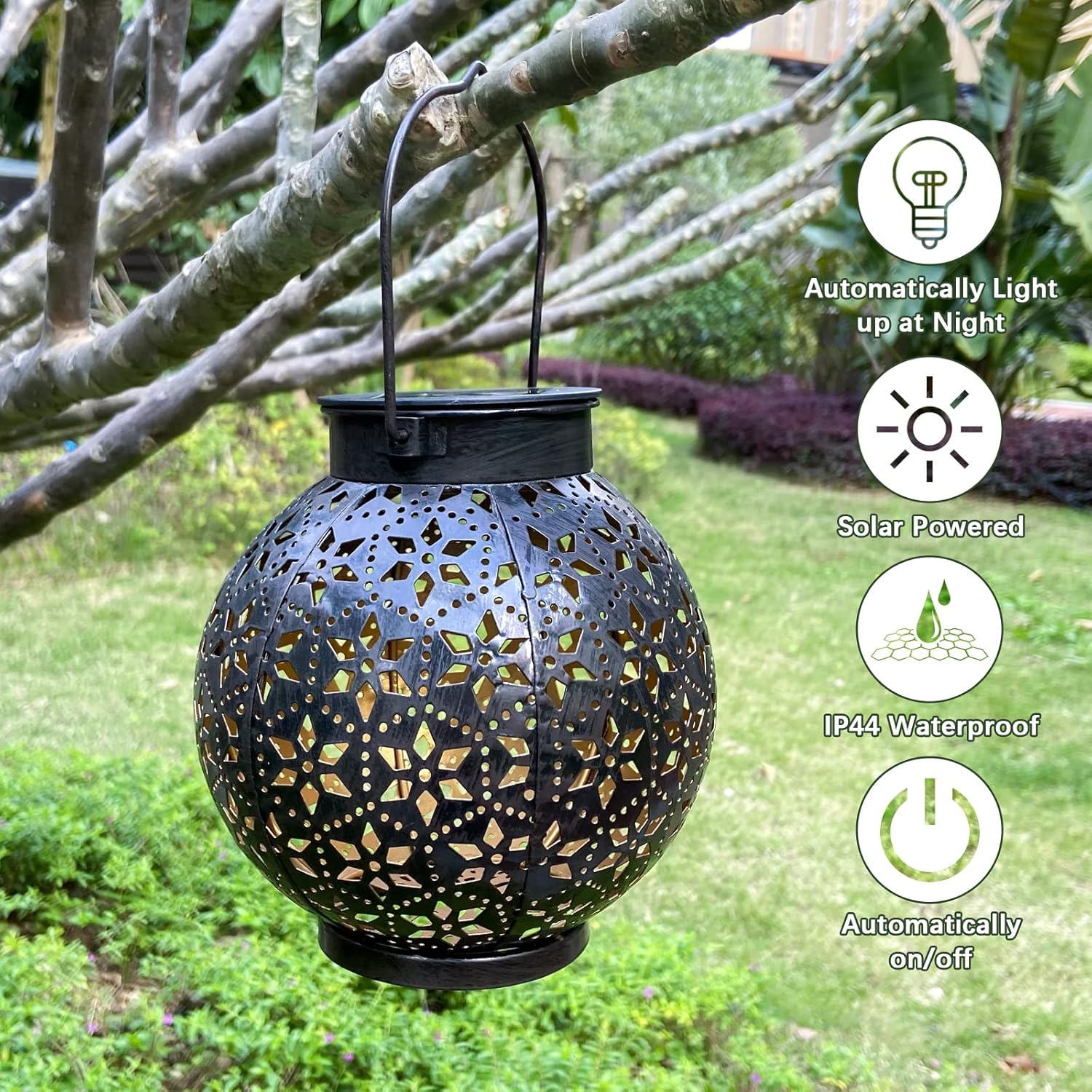 - Energy-Saving and Waterproof: The garden lantern automatically turn the lights on at dusk and off at dawn, saves energy. The hanging solar lantern made with quality metal, which is water-resistant and weather-resistant, could be a nice outdoor decoration through out the whole year.
