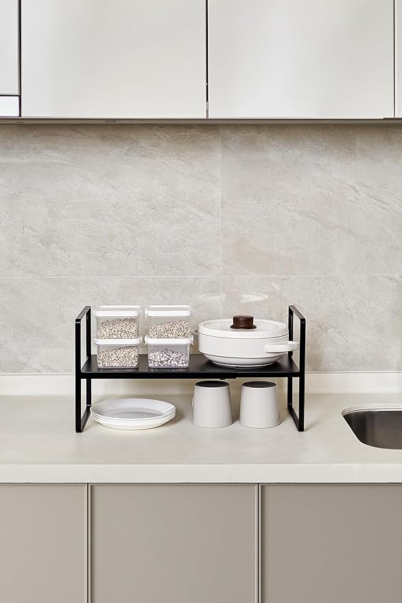 Nxconsu Cabinet Shelf Expandable Height Adjustable Organizer Riser for Kitchen Cabinet Pantry Cupboard Under Sink Countertop Organization Storage Space Saver Stackable Heavy Duty Metal Black