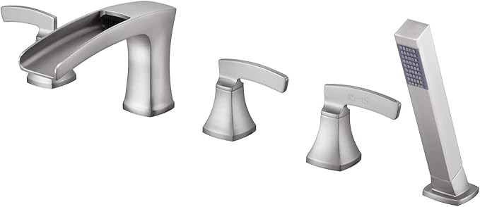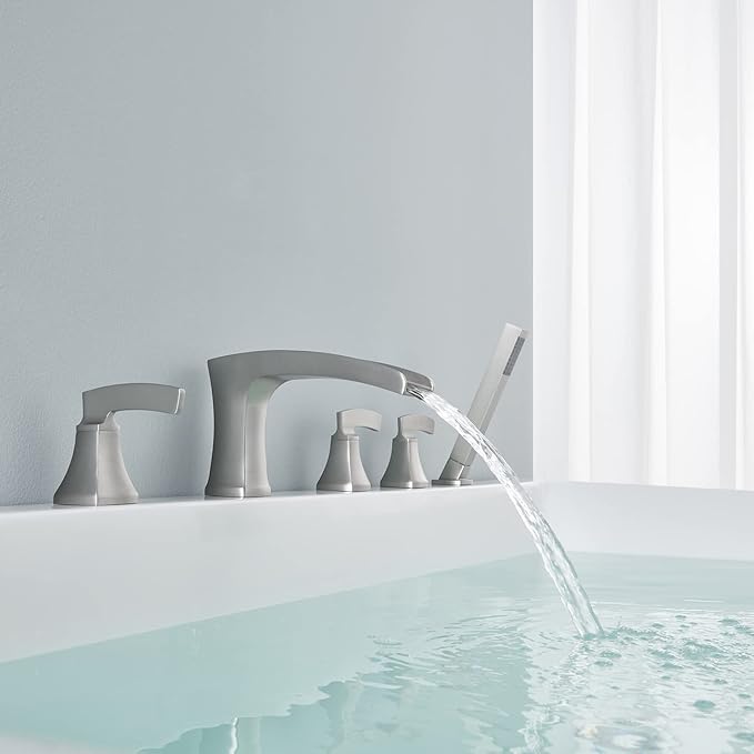 Roman Tub Faucet Waterfall Deck Mount Tub Filler Brushed Nickel Bathtub Faucets 5 Hole Brass Bathroom Faucets with Hand Shower