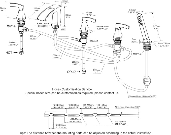 - Waterlines: 1/2’’ hot&cold hoses for large water flow (3/8'' hoses can be customized); Special hoses size/length can be made as required, please contact us.