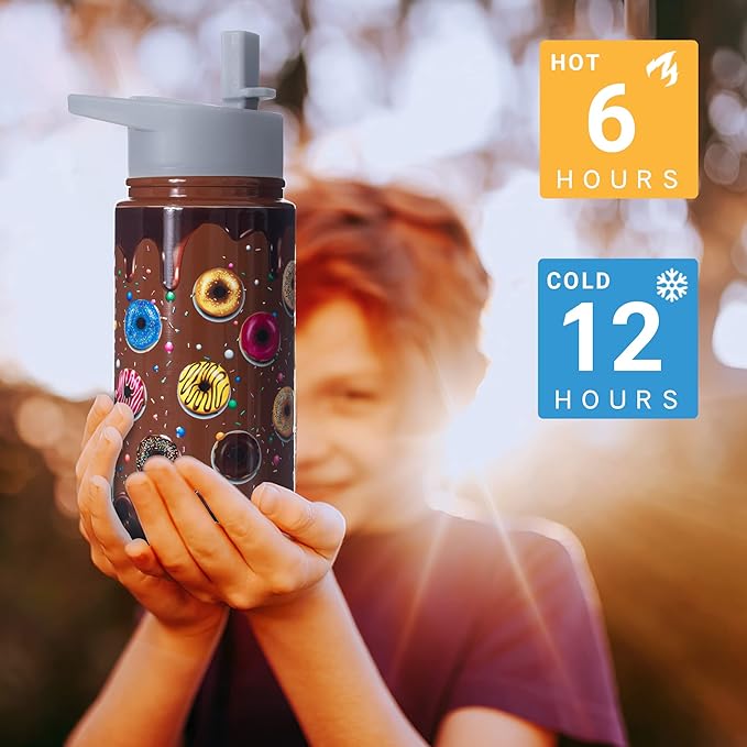 - 【Donut Delight】: Indulge in a sweet sip with our 15oz, BPA-free, donut-themed water bottle! Splashed with colorful, enticing donut designs, this tumbler turns hydration into a delightful treat for your little sweetheart. Let each drink be a donut-filled delight!