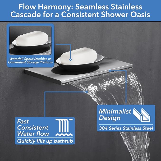 - Unique Waterfall Design: Our 9-inch ultra-wide bathtub spout flows up to 5 gpm creating a beautiful waterfall effect. The unique shelf-like design allows you to save storage space in the bathroom by placing items on top.