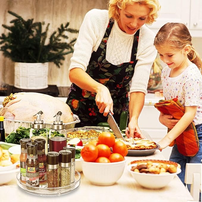 - 【MULTI-PURPOSE STORAGE】Perfect large lazy susan turntable for cabinet,kitchen, pantry, countertop, fridge, bathroom, bedroom, under the sink. It can fit condiments, spices, bottles, cans, drinks, snacks, makeups bath supplies, etc. The clear lazy susan organizer is also a light weight but sturdy tray when you want to move items.