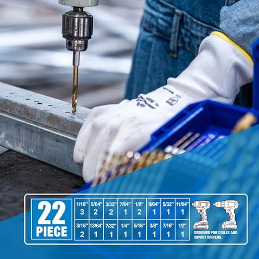 - Sizes and Package - Drill bit sizes include: 1/16"x3, 5/64"x2, 3/32"x2, 7/64", 1/8“x2, 9/64", 5/32", 3/16"x2, 13/64", 7/32", 15/64", 1/4", 5/16", 3/8", 7/16" 1/2". 22 PCS drill bit set in a double blister pack with easy opening design.
